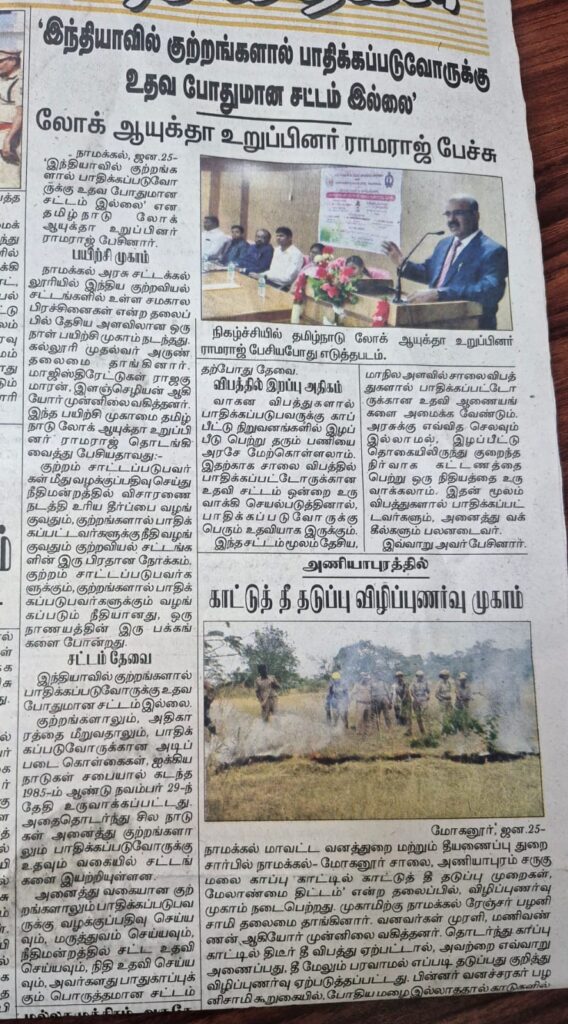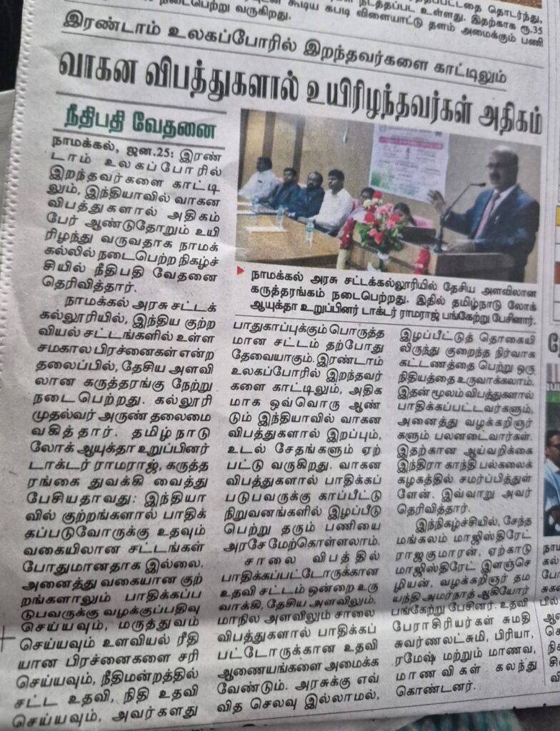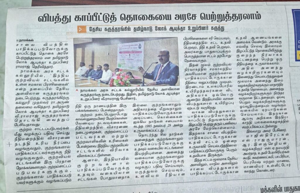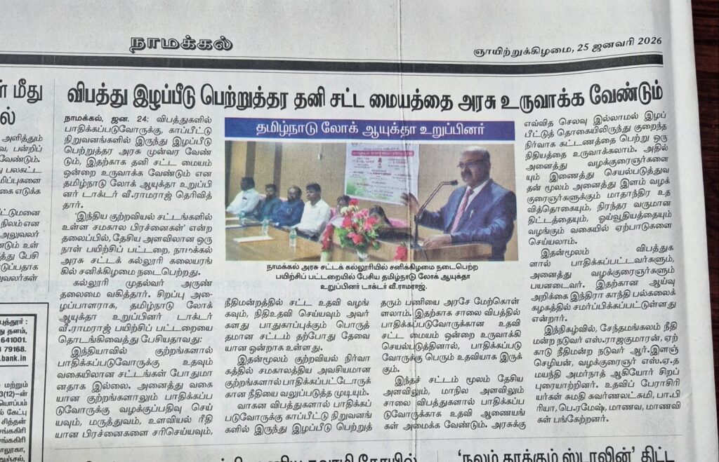 இந்திய குற்றவியல் சட்டங்களில் உள்ள சமகால பிரச்சனைகள் என்ற தலைப்பில் நாமக்கல் அரசு சட்டக் கல்லூரியில் கல்லூரி முதல்வர் அருண் தலைமையில் தேசிய அளவிலான ஒரு நாள் பயிற்சி பட்டறை நடைபெற்றது. இதனை தமிழ்நாடு லோக் ஆயுக்தா உறுப்பினர் டாக்டர் வீ. ராமராஜ் துவக்கி வைத்தார்.