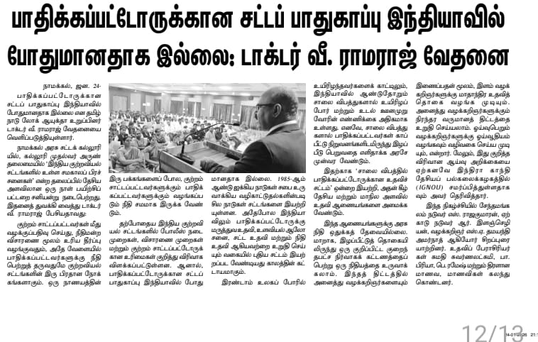 குற்றம் சாட்டப்படுபவர்கள் மீது வழக்கு பதிவு செய்து நீதிமன்றத்தில் விசாரணை நடத்தி உரிய தீர்ப்பை வழங்குவதும் குற்றங்களால் பாதிக்கப்பட்டவர்களுக்கு நீதி வழங்குவதும் குற்றவியல் சட்டங்களின் இரண்டு பிரதான நோக்கங்கள் ஆகும். குற்றம் சாட்டப்படுபவர்களுக்கும் குற்றங்களால் பாதிக்கப்படுபவர்களுக்கும் வழங்கப்படும் நீதியானது ஒரு நாணயத்தின் இரண்டு பக்கங்களைப் போன்றதாகும் என்று வீ. ராமராஜ் தெரிவித்தார்.(செய்தி படத்துக்கு கீழே தொடர்கிறது)
