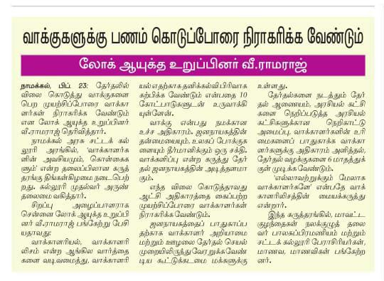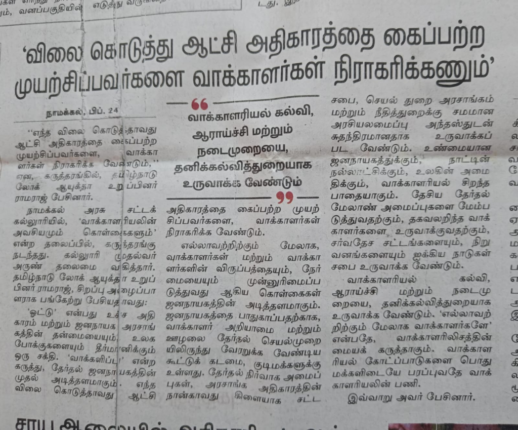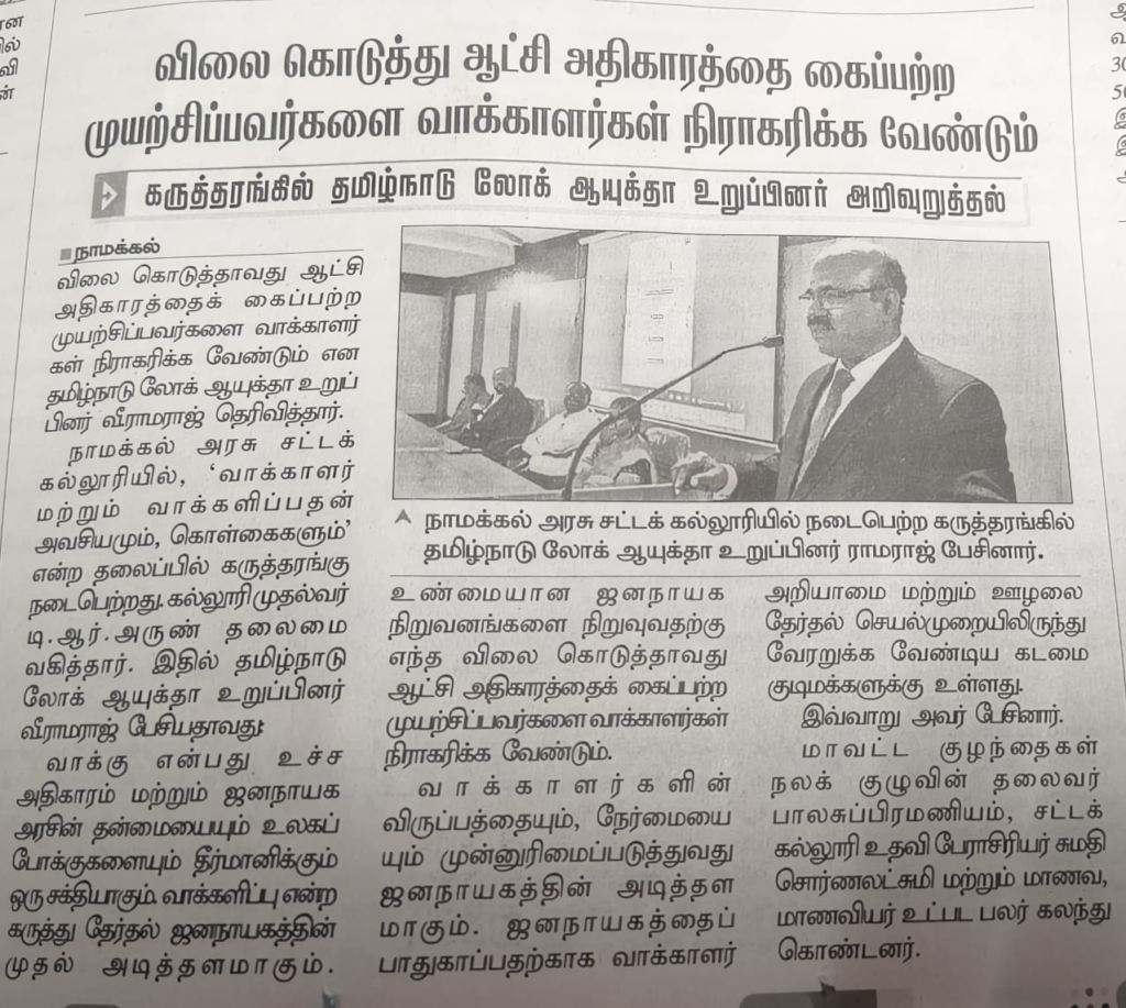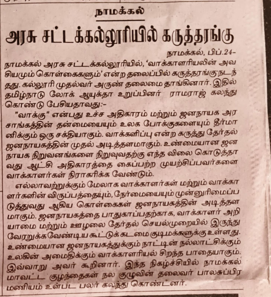 A seminar on the topic of ‘Necessity and Principles of Voterology’ was held at Namakkal Government Law College, presided over by Principal Arun. In 1996, the words ‘Voterology’ and ‘voterologism’ were coined and ten reasons why voterology should be taught as a separate academic discipline were formulated by Dr. V. Ramaraj, the current member of the Tamil Nadu Lokayukta. He has formulated ten principles of voterology and ten subject areas for learning, said the college principal Arun. We read the names of foreigners as the fathers of many academic disciplines. However, it is a matter of pride for Tamil Nadu that Lokayukta Ramaraj, who introduced the subject of voterology and the theory of voterologism, is the father of voterology, said Balasubramaniam, Chair Person of Namakkal District Child Welfare Committee, speaking at the seminar.
