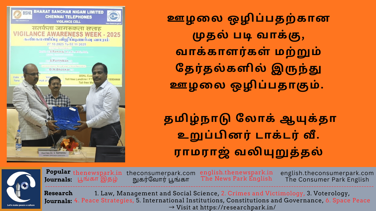 தமிழ்நாடு பிஎஸ்என்எல் சார்பில் தலைமை பொது மேலாளர் எஸ். பார்த்திபன் தலைமையில் சென்னையில் அண்ணா சாலையில் உள்ள பிஎஸ்என்எல் அலுவலகத்தில் ஊழலுக்கு எதிரான விழிப்புணர்வு வார விழா நடைபெற்றது. இந்நிகழ்ச்சியில் தமிழ்நாடு லோக் ஆயுக்தா உறுப்பினர் டாக்டர் வீ. ராமராஜ் சிறப்பு விருந்தினராக கலந்து கொண்டு பேசியதாவது.