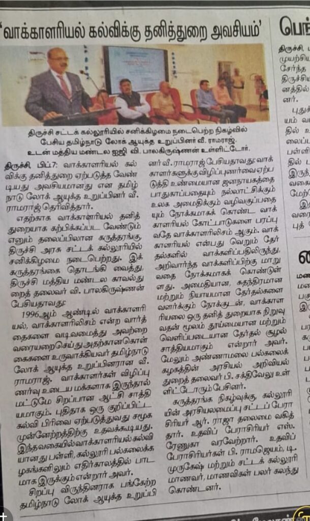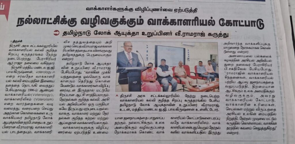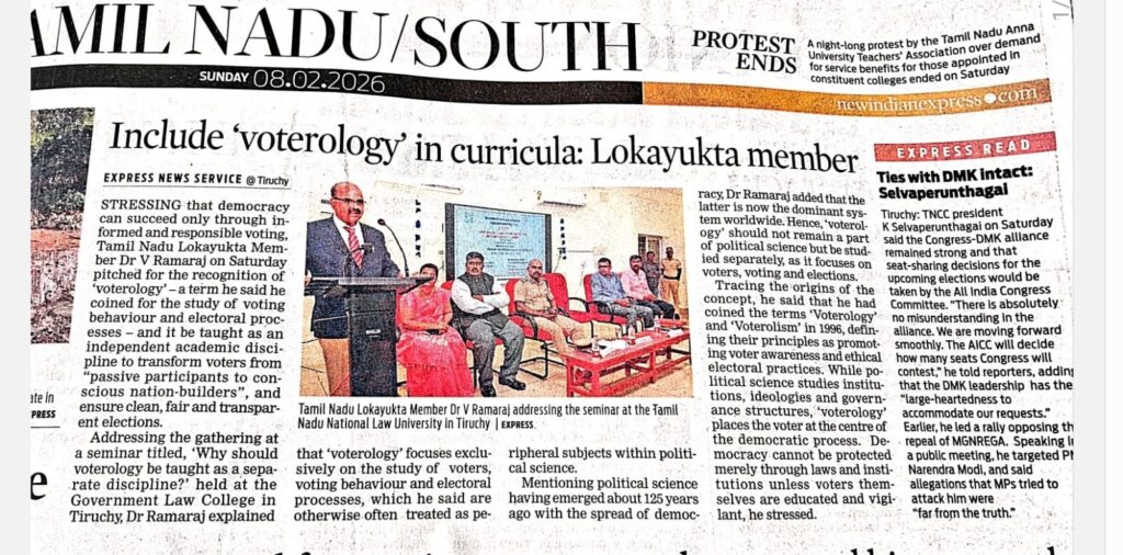 A seminar on the topic “Why should Voterology be taught as a separate discipline?” was held at the Government Law College, Trichy. Dr. V. Ramaraj, the current member of the Tamil Nadu Lokayukta, is the one who coined the terms Voterology ‘ and ‘Voterolism’ in 1996, defining them and formulating the necessary theories. We know foreigners as the fathers of many academic disciplines, including political science and sociology. However, it is a matter of pride for Tamil Nadu that Dr. V. Ramaraj, who introduced the subject of Voterology and the philosophy of Voterolism, is considered the father of Voterology, said Constituional Law Professor R. Raja, who presided over the seminar.
