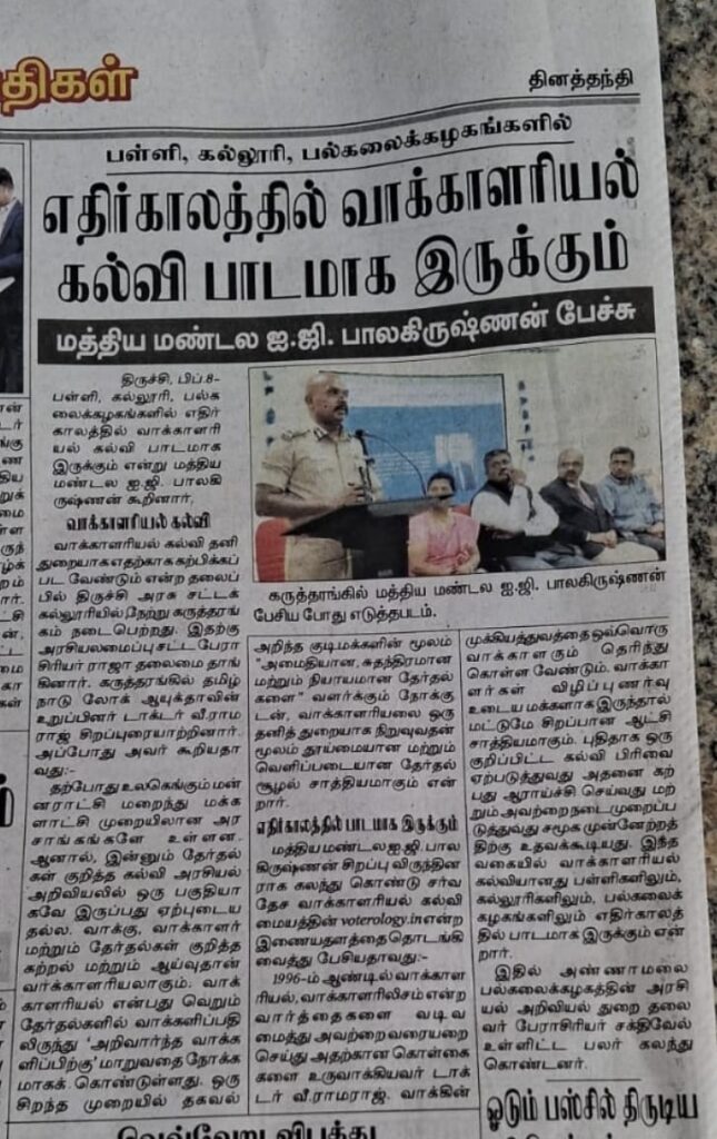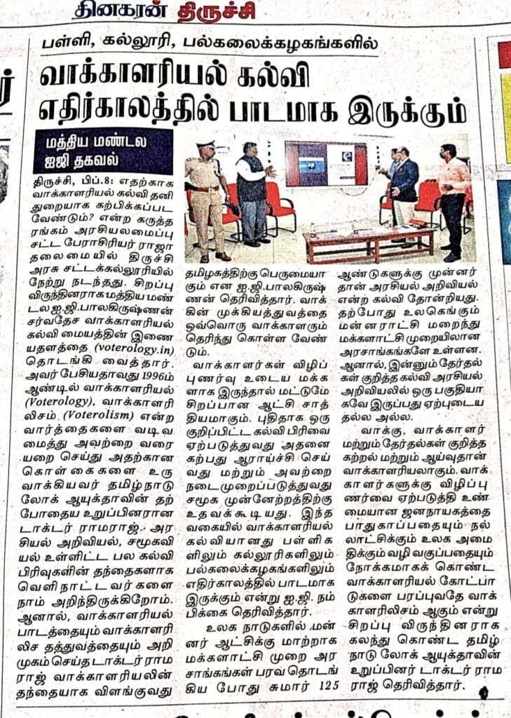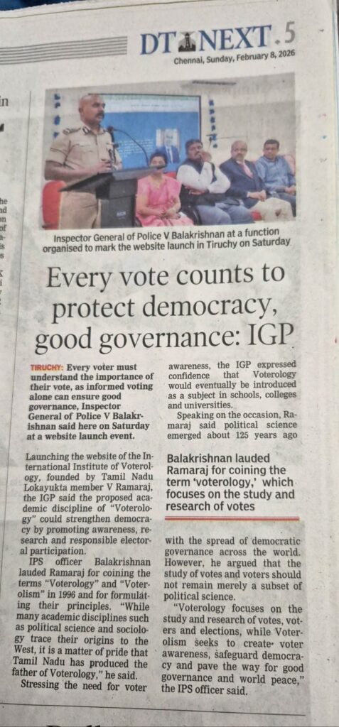 Central Zone Inspector General of Police of Police V.Balakrishnan launched the website of the International Institute of Voterology (voterology.in). V. Balakrishnan emphasized that voterology should be introduced as a subject in schools, colleges, and universities.