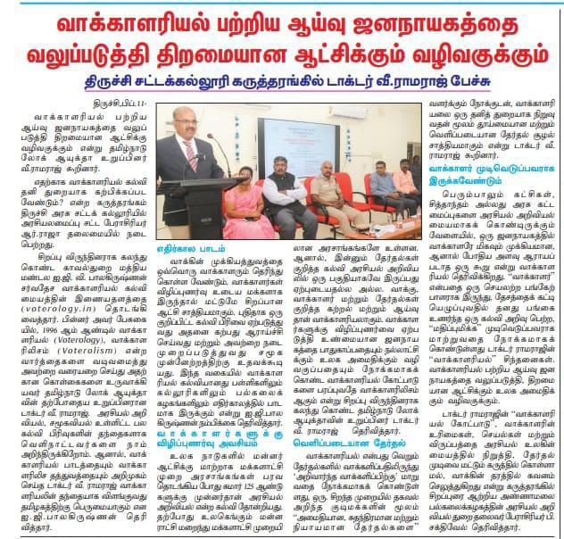 எதற்காக வாக்காளரியல் கல்வி தனி துறையாக கற்பிக்கப்பட வேண்டும்? என்ற கருத்தரங்கம் திருச்சி அரசு சட்டக் கல்லூரியில் அரசியலமைப்பு சட்ட பேராசிரியர் ஆர். ராஜா தலைமையில் நடைபெற்றது. சிறப்பு விருந்தினராக கலந்து கொண்ட காவல்துறை மத்திய மண்டல ஐ.ஜி. வி. பாலகிருஷ்ணன் சர்வதேச வாக்காளரியல் கல்வி மையத்தின் இணையதளத்தை (voterology.in) தொடங்கி வைத்தார். அவர் பேசியதாவது
